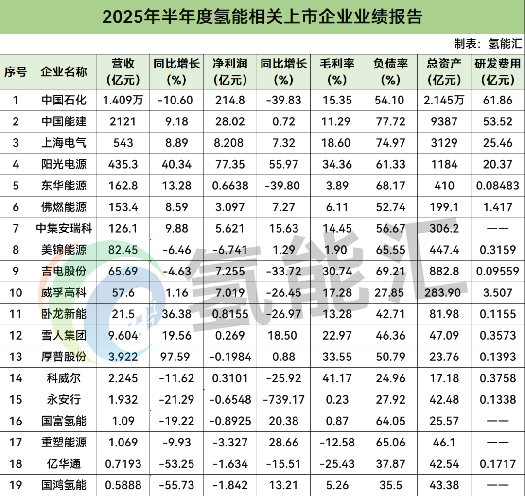近期,各大相關氫能上市企業公布2025年半年度業績報告,氫能匯對其中19家上市企業業績情況進行了梳理。