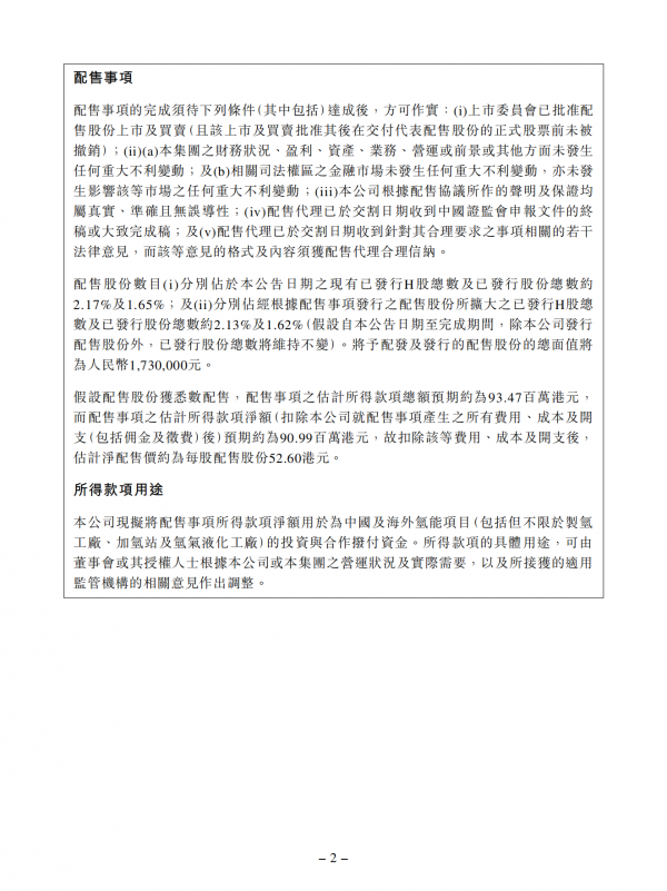 8月31日,國富氫能發布公告,擬配售173.00萬股H股,配售價格為每股54.03港元,較8月29日收市價折讓約17.00%。預計募集資金凈額約為9099.00萬港元。此次配售所得款項擬用于中國及海外氫能項目(包括但不限于制氫工廠、加氫站及氫氣液化工廠)的投資與合作。配售后,控股股東鄔品芳持股比例將從25.31%降至24.90%。