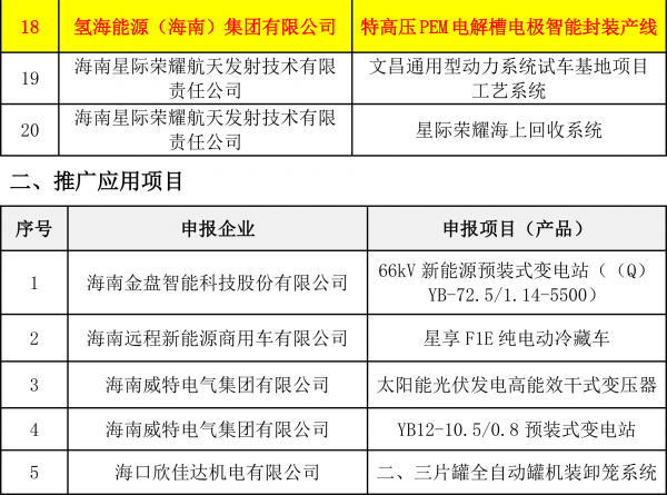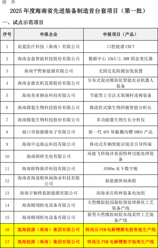9月2日,海南省工業和信息化廳公布2025年度海南省先進裝備制造首臺套項目(第一批),氫海能源(海南)集團有限公司“特高壓PEM電解槽膜電極智能生產線”、“特高壓PEM電解槽數字裝堆生產線”、“特高壓PEM電解槽電極智能封裝產線”三個項目入選。