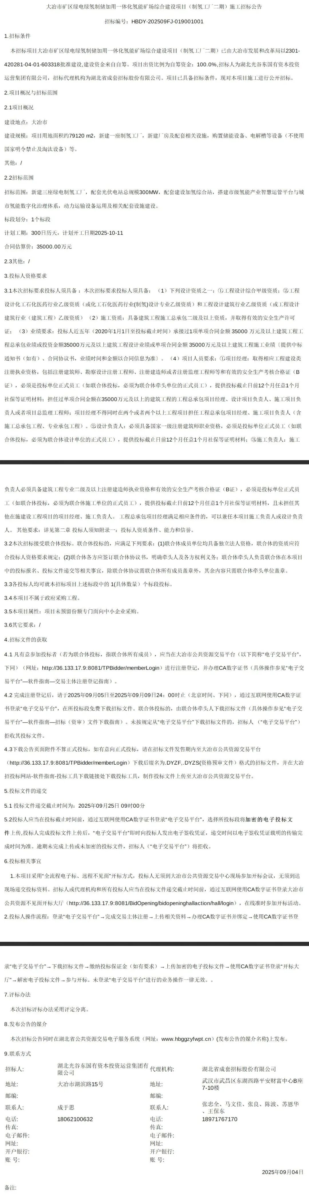 9月4日,大冶市礦區(qū)綠電綠氫制儲加用一體化氫能礦場綜合建設項目(制氫工廠二期)施工招標公告。