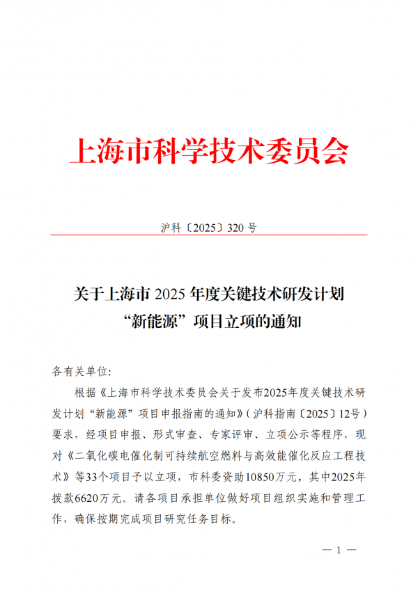 9月2日,上海市科學技術委員會發布《關于上海市2025年度關鍵技術研發計劃“新能源”項目立項的通知》,對《二氧化碳電催化制可持續航空燃料與高效能催化反應工程技術》等33個項目予以立項,市科委資助10850萬元,其中2025年撥款6620萬元。