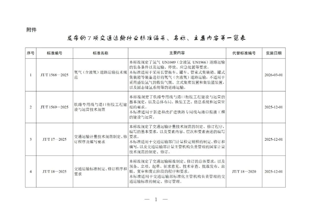 附件:發布的7項交通運輸行業標準編號、名稱、主要內容等一覽表