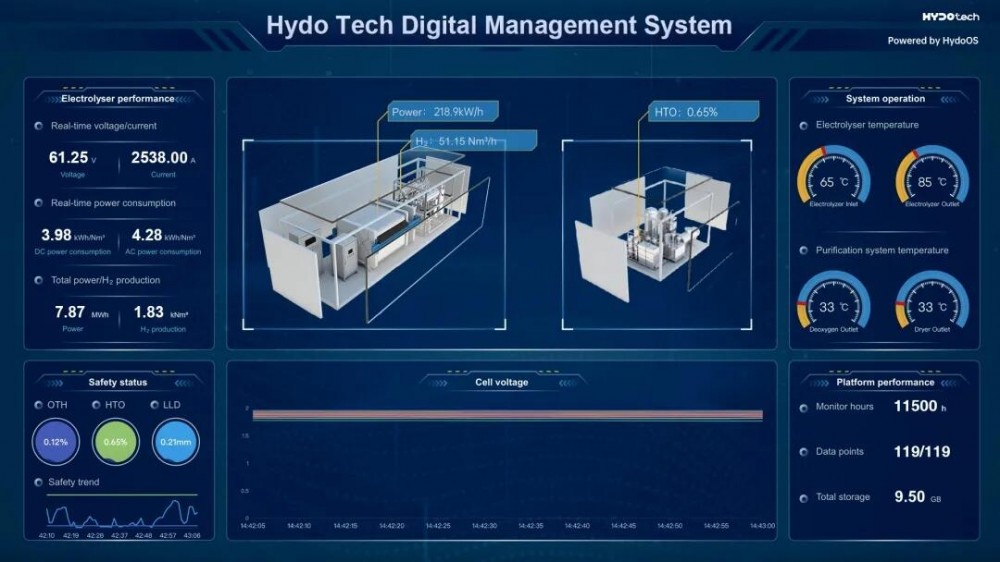 優(yōu)越性能之外,HydoLyser?更是數(shù)字原生的制氫系統(tǒng)。結(jié)合HydoLyser?插片式構(gòu)型與自研HydoOS?綠氫智能管理系統(tǒng),海德氫能為客戶(hù)打造覆蓋全生命周期內(nèi)的電解槽健康狀態(tài)監(jiān)測(cè)與運(yùn)維服務(wù)能力,基于HydoOS? CVM技術(shù)可實(shí)時(shí)監(jiān)控單個(gè)小室的健康狀態(tài),對(duì)于已識(shí)別的故障單片可在項(xiàng)目現(xiàn)場(chǎng)12小時(shí)之內(nèi)完成快速的更換或升級(jí),并嚴(yán)格遵循石化行業(yè)標(biāo)準(zhǔn)建立了完整的現(xiàn)場(chǎng)操作流程,運(yùn)維成本降低至少90%以上,解決行業(yè)核心痛點(diǎn)。