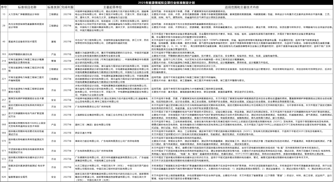 在附件《2025年能源領域行業(yè)標準制定計劃》中包含近20項氫能、氫基燃料及燃料電池相關內容,其中固體氧化物燃料電池相關內容達到5項,可再生能源制氫相關內容5項,輸氫管道、摻氨燃燒2項,氫壓力容器、甲醇應用、燃料電池氣體擴散層、固定式燃料電池發(fā)電等內容各1項。