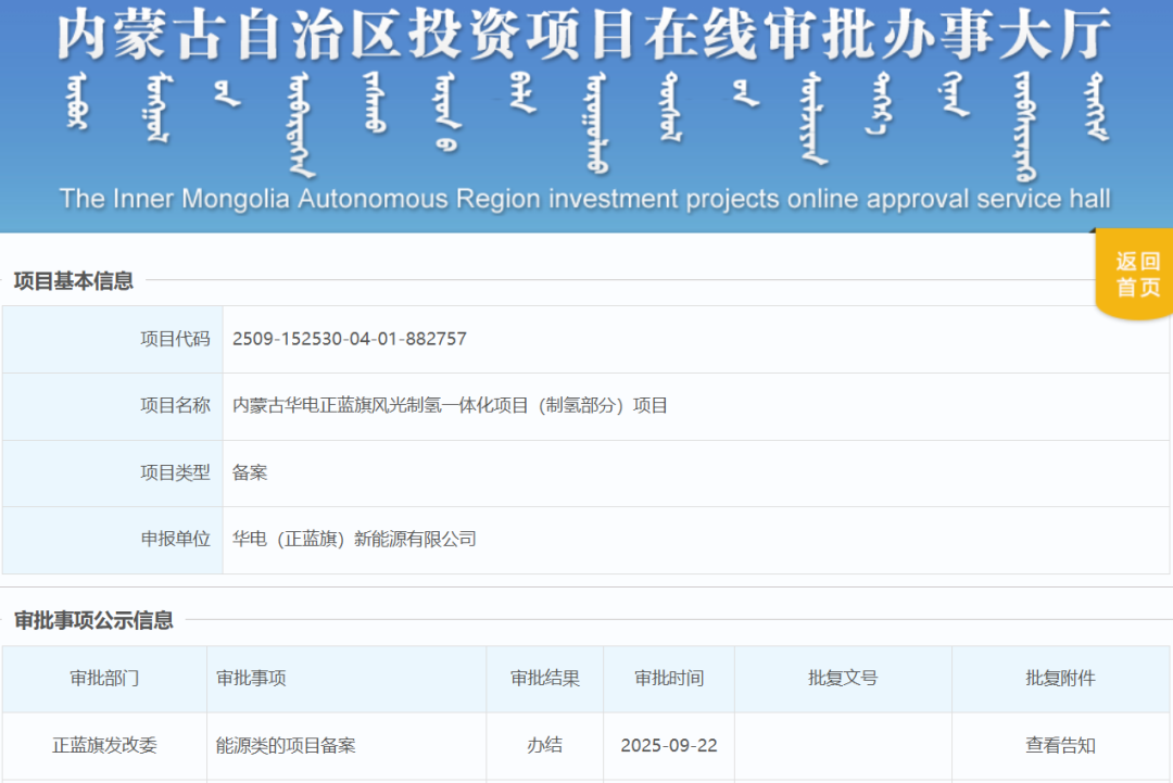 9月22日,內蒙古華電正藍旗風光制氫一體化項目(制氫部分)項目獲備案。