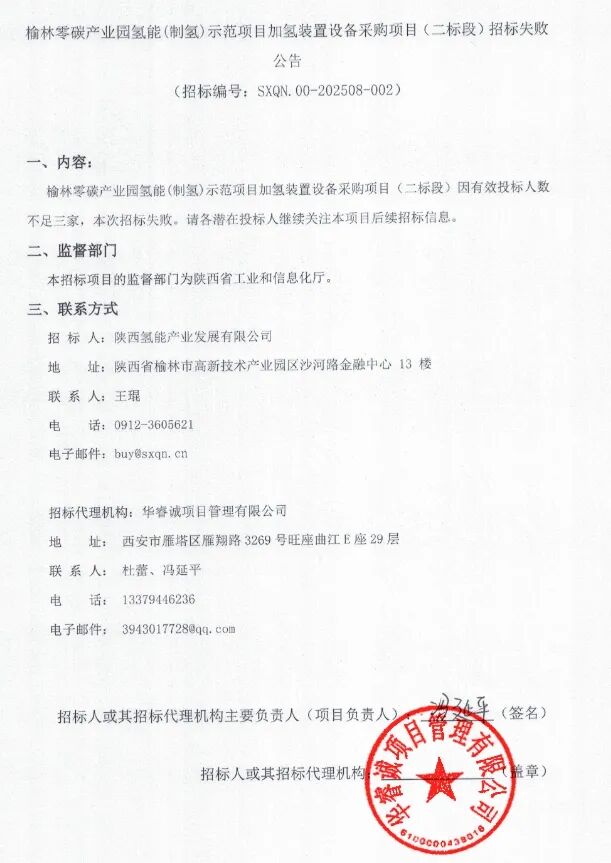 9月19日,榆林零碳產(chǎn)業(yè)園氫能(制氫)示范項目加氫裝置設備采購項目(二標段)招標失敗公告。其原因為有效投標人數(shù)不足三家。