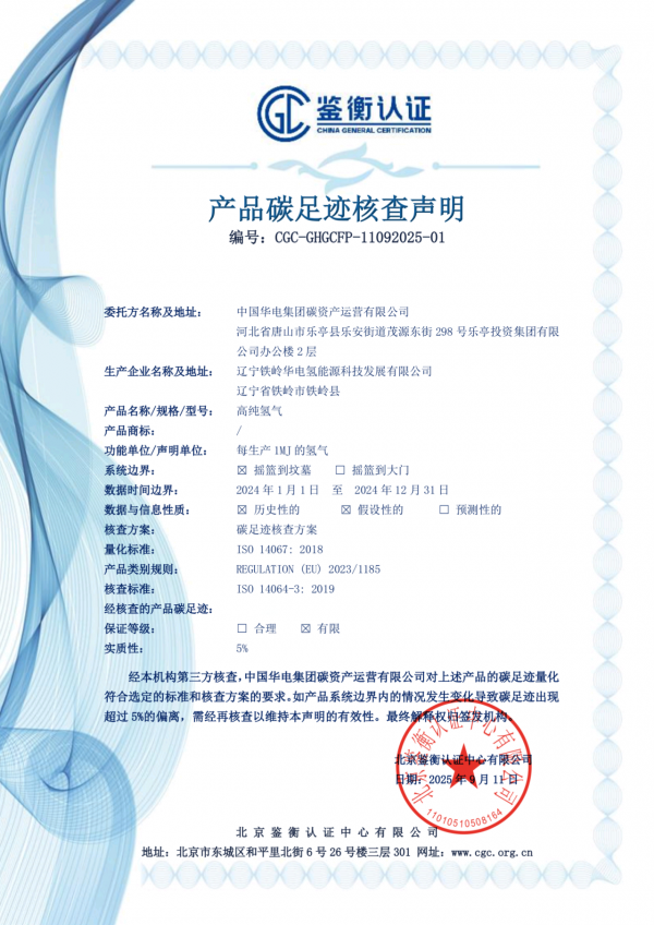 近日,在中國華電集團市場營銷部指導下,華電碳資產公司牽頭依托遼寧華電鐵嶺新臺子一期25MW風電離網儲能制氫一體化項目,成功完成集團首個高純氫氣產品碳足跡核算,形成專業核算報告。構建起覆蓋全生命周期的綠氫產品碳足跡標識認證方案,開創性開展綠色認證實踐。