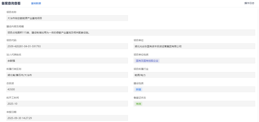 近日,湖北政務服務網信息顯示,大冶市臨空氫能源產業基地項目通過備案。