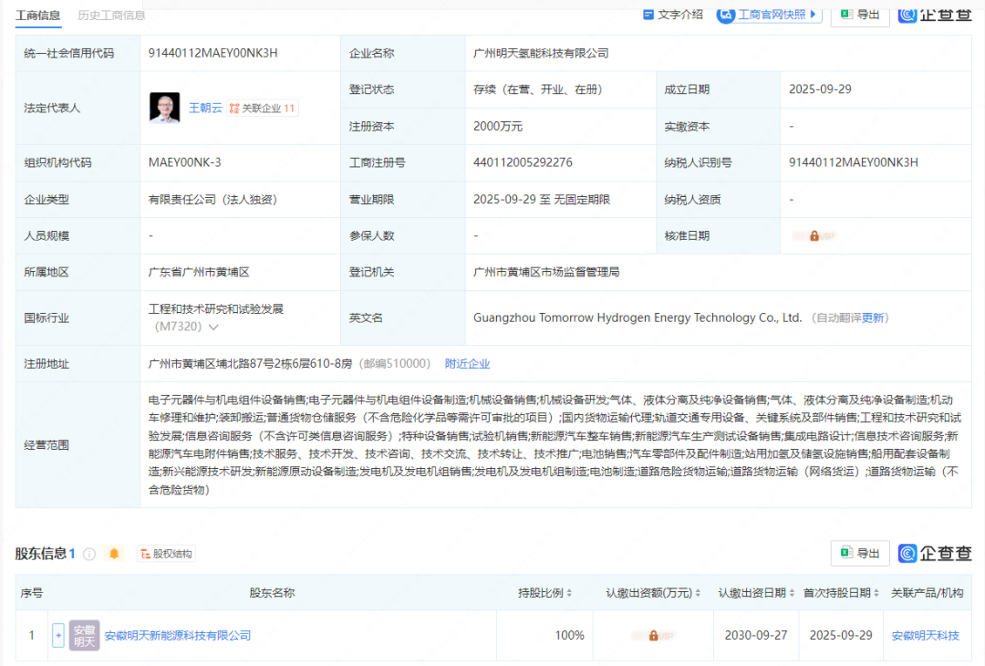 9月29日,廣州明天氫能科技有限公司成立,注冊資本2000萬,法定代表人王朝云。