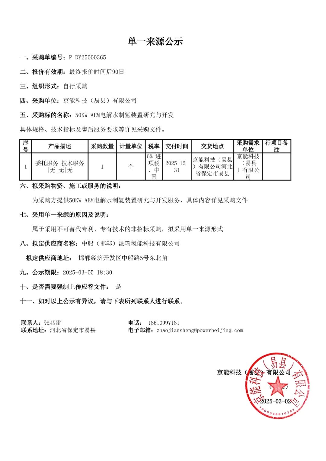 10月9日,京能科技(易縣)有限公司AEM水電解制氫項目工程總承包采購公告發布。
