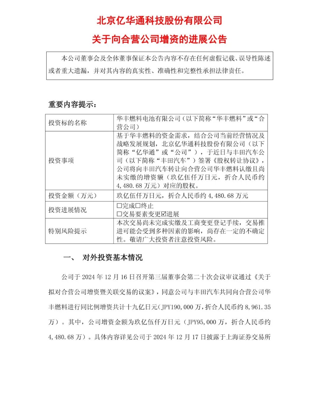 此前在2024年12月16日,億華通第三屆董事會第二十次會議審議通過向華豐燃料同比例增資議案,公司與豐田汽車共同增資19億日元(折合人民幣約8,961.35萬),其中億華通增資金額為9.5億日元(折合人民幣約4,480.68萬)。該增資已完成工商變更登記,華豐燃料注冊資本由45億日元增至64億日元(折合人民幣約30,185.60萬),億華通持股比例仍為50%。