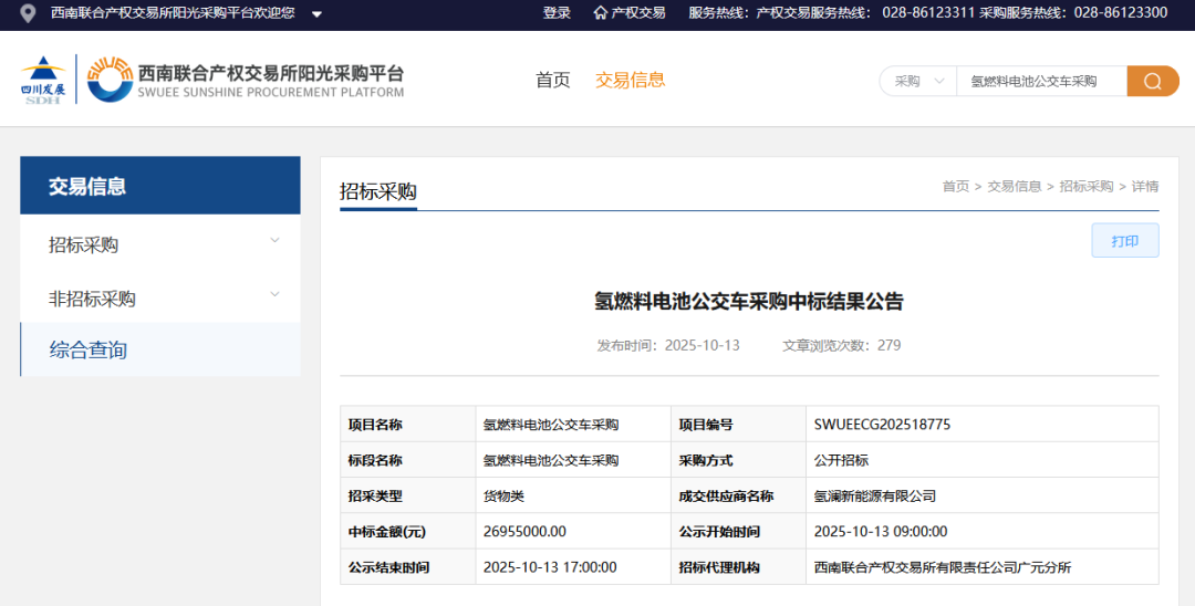 10月13日,西南聯合產權交易所發布氫燃料電池公交車采購中標結果公告。中標人為氫瀾新能源有限公司,中標金額為 26,955,000.00元。