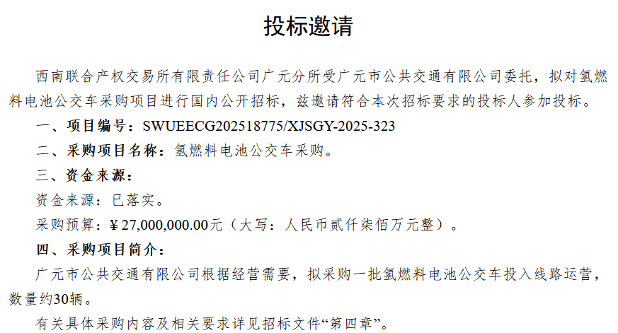 此前招標公告顯示,廣元市公共交通有限公司根據經營需要,擬采購一批氫燃料電池公交車投入線路運營,數量約30輛,預算2700萬元。