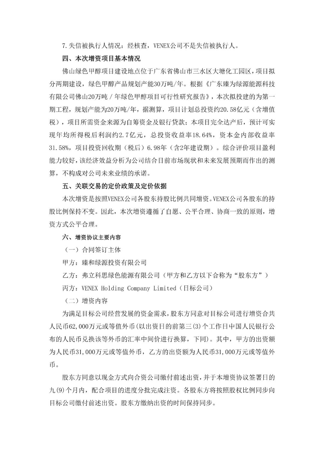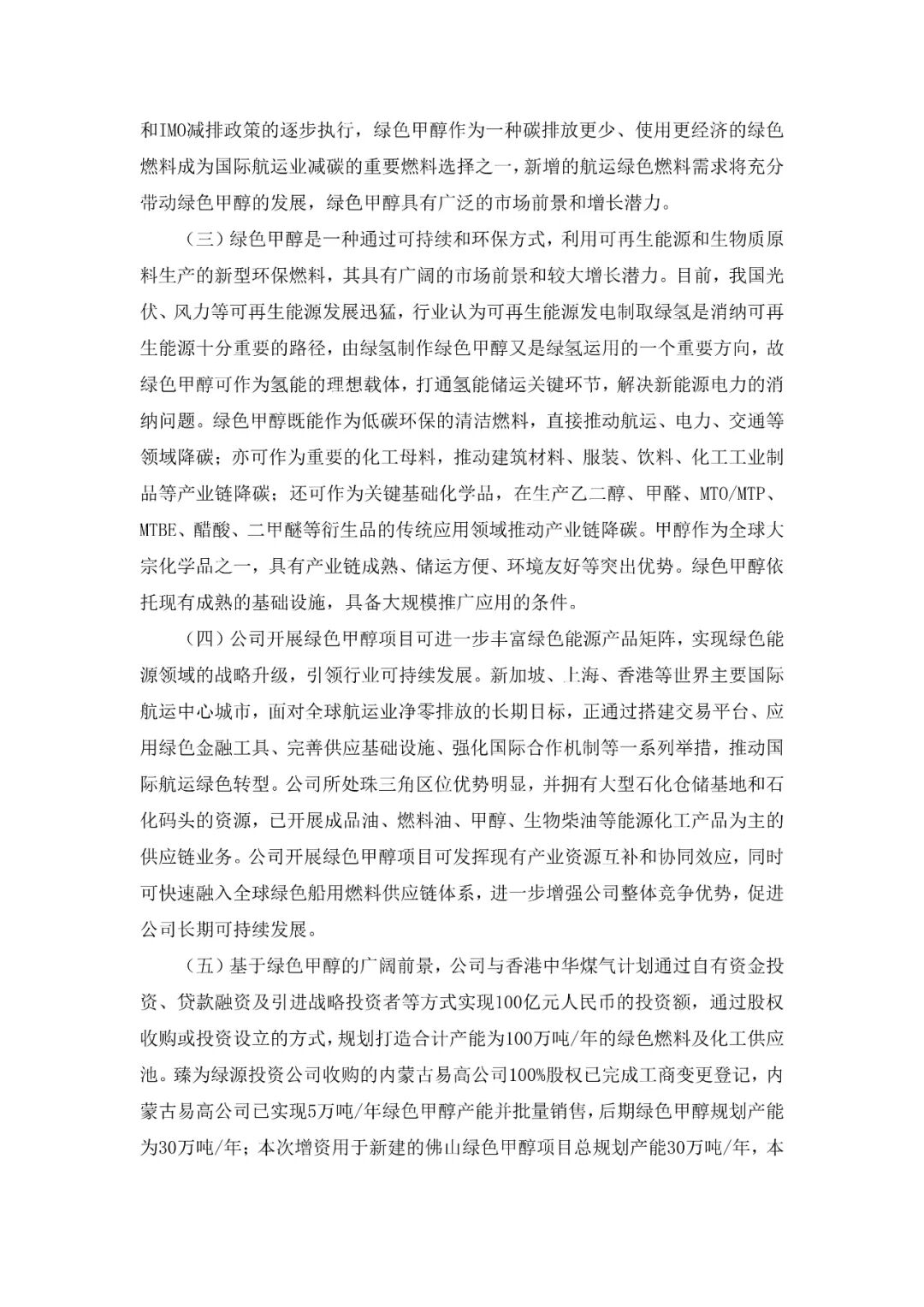 臻為綠源投資公司在佛山市三水區設立全資子公司廣東臻為綠源能源科技有限公司(簡稱“臻為綠源科技公司”),由其投資建設位于佛山市三水區的20萬噸/年綠色甲醇項目(簡稱“佛山綠色甲醇項目”)。