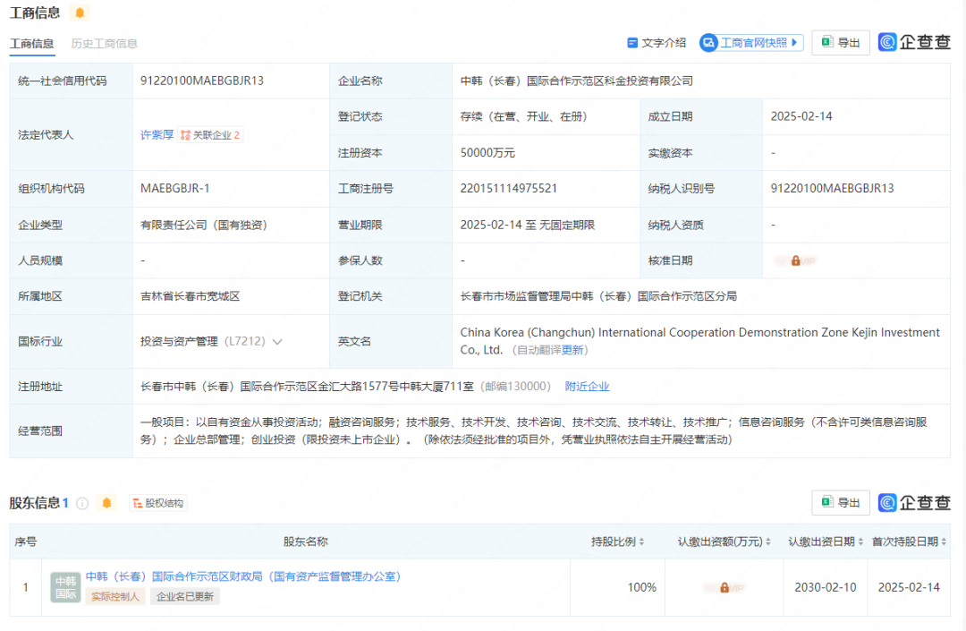 企查查顯示,中韓科金投資公司成立于2025年2月14日,注冊資本5億元,法定代表人許紫厚,是由中韓(長春)國際合作示范區財政局(國有資產監督管理辦公室)100%持股的國有企業。