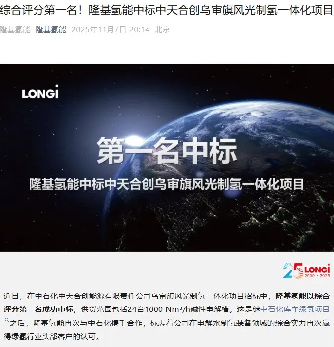 11月7日,隆基氫能官微發(fā)布“綜合評分第一名!隆基氫能中標中天合創(chuàng)烏審旗風光制氫一體化項目”信息。