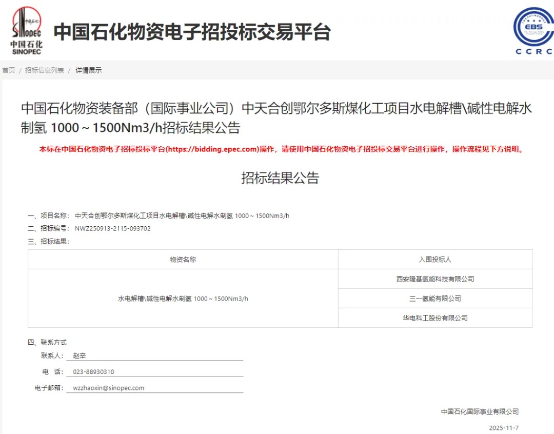 同時,中國石化物質電子招投標交易平臺發(fā)布中國石化物資裝備部(國際事業(yè)公司)中天合創(chuàng)鄂爾多斯煤化工項目水電解槽\堿性電解水制氫 1000~1500Nm3/h招標結果公告,隆基、三一、華電科工為入圍投標人。