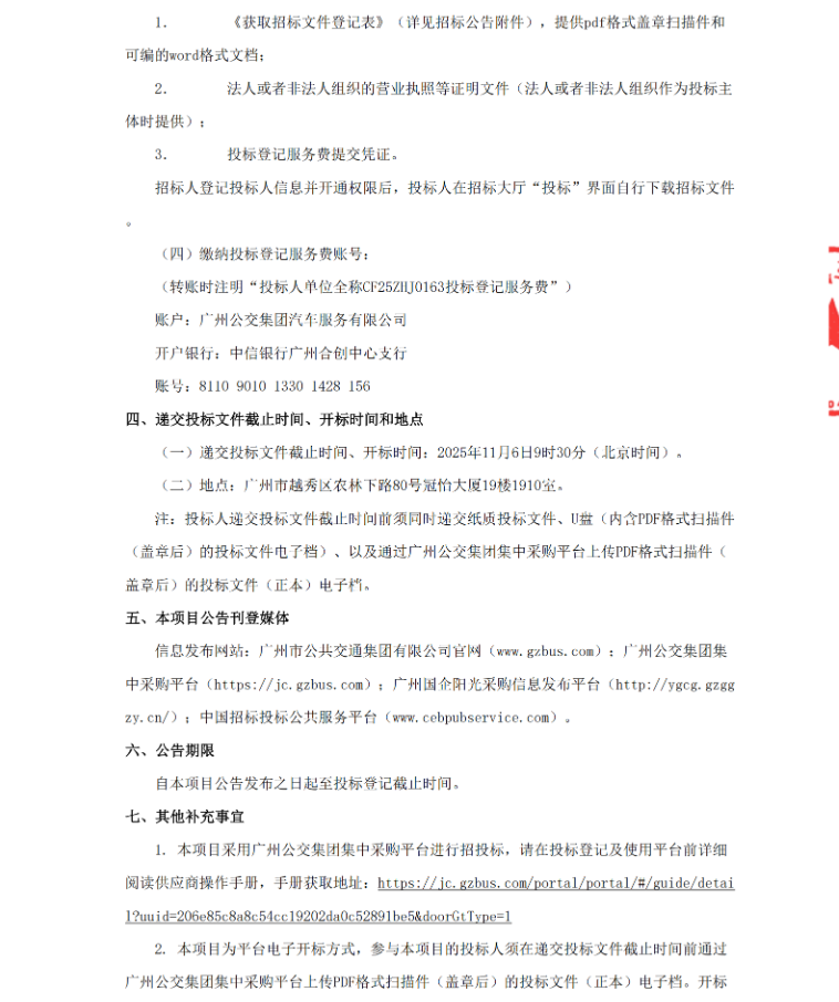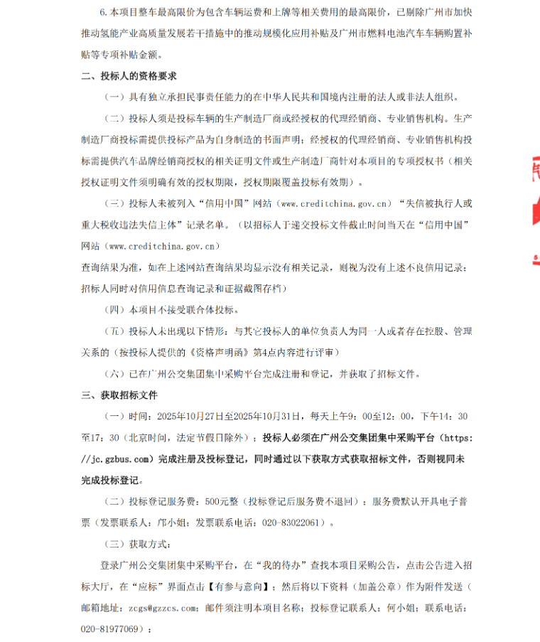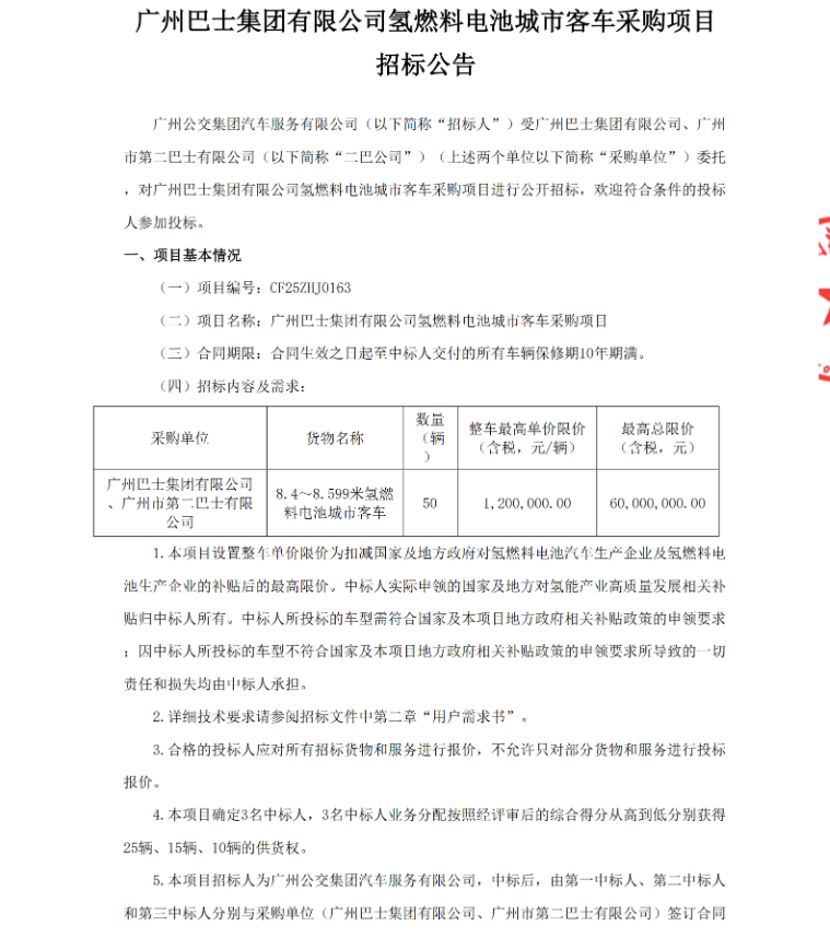 根據招標公告,采購單位為廣州巴士集團有限公司、廣州市第二巴士有限公司。計劃采購50輛8.4~8.599米氫燃料電池城市客車。整車最高單價限價為120萬元/輛(含稅),最高總限價6000萬元(含稅)。