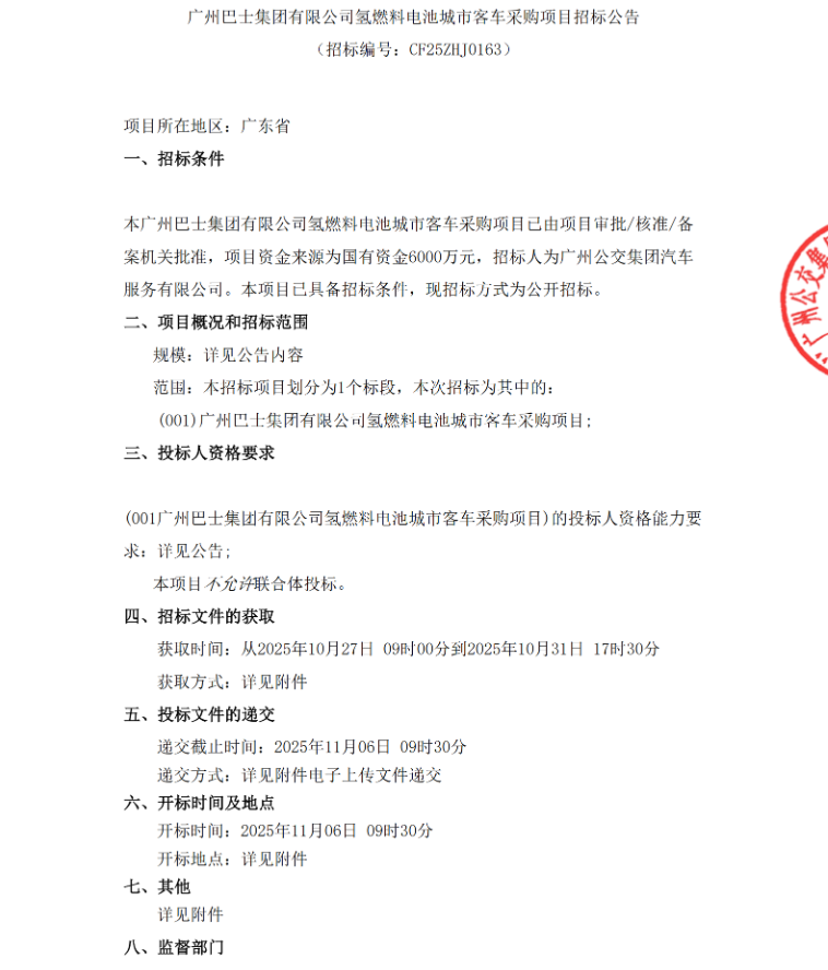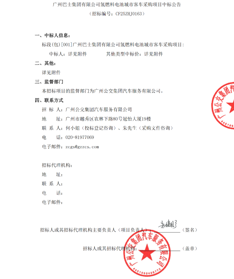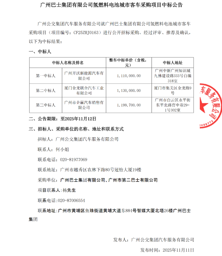 11月11日,廣州巴士集團有限公司氫燃料電池城市客車采購項目中標公告。