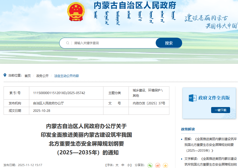 11月12日,內蒙古自治區人民政府辦公廳關于印發全面推進美麗內蒙古建設筑牢我國北方重要生態安全屏障規劃綱要(2025—2035年)的