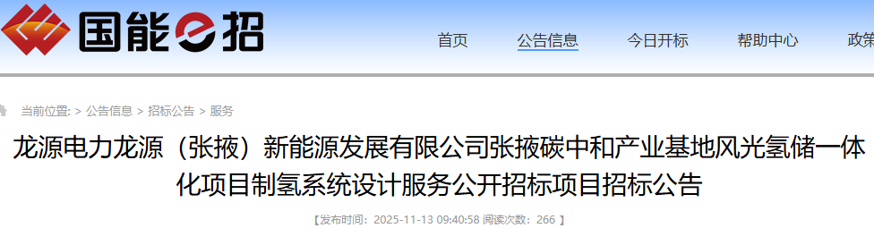 11月13日,龍源電力龍源(張掖)新能源發展有限公司張掖碳中和產業基地風光氫儲一體化項目制氫系統設計服務公開招標項目招標公告。