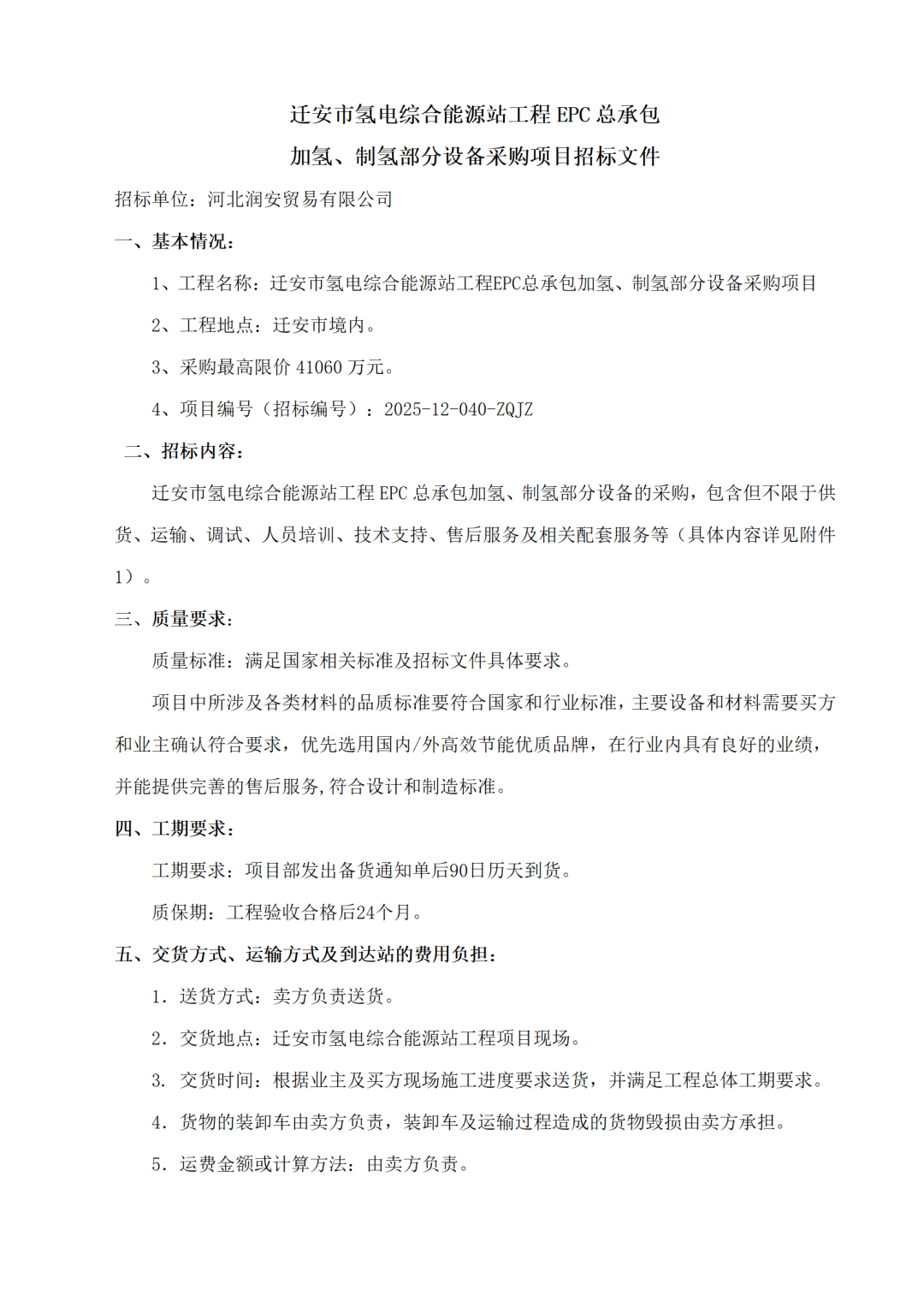 根據招標公告,遷安市氫電綜合能源站工程EPC總承包加氫、制氫部分設備采購項目位于遷安市境內,采購最高限價41060萬元。