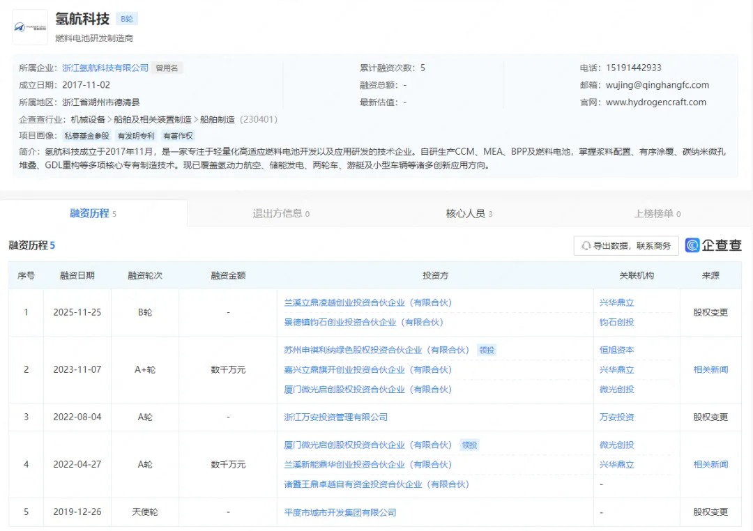 獲悉,近日,浙江氫航科技有限公司(簡稱“氫航科技”)完成B輪融資,融資金額未透露,投資方為興華鼎立和鈞石創(chuàng)投,完成此次融資后,氫航科技股權(quán)發(fā)生變更。
