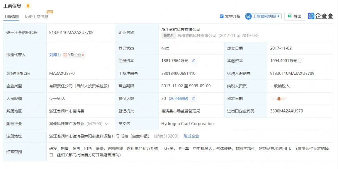氫航科技成立于2017年,曾用名杭州氫航科技有限公司,注冊資本1881.79萬元,法定代表人劉海力。
