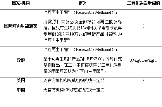 2021年國際可再生能源署IRENA發布《創新場景:可再生甲醇》,報告指出“可再生甲醇”(Renewable Methanol)所需原料來源必須全部符合可再生能源標準,且只有生物質循環利用及綠電制綠氫再制甲醇的這兩種方式的甲醇產品才能稱為“可再生甲醇”。