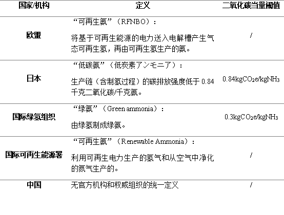 2022年,國際可再生能源署(IRENA)和氨能協會(AEA)聯合發布《創新展望:可再生氨》,報告中定義“可再生氨”(Renewable Ammonia)是利用可再生電力生產的氫氣和從空氣中凈化的氮氣生產的??稍偕庇糜谏a氨的所有原料和能源都必須是可再生能源(生物質、太陽能、風能、水電、地熱等)。國際可再生能源署對于生產每單位綠氨的二氧化碳當量沒有明確規定。